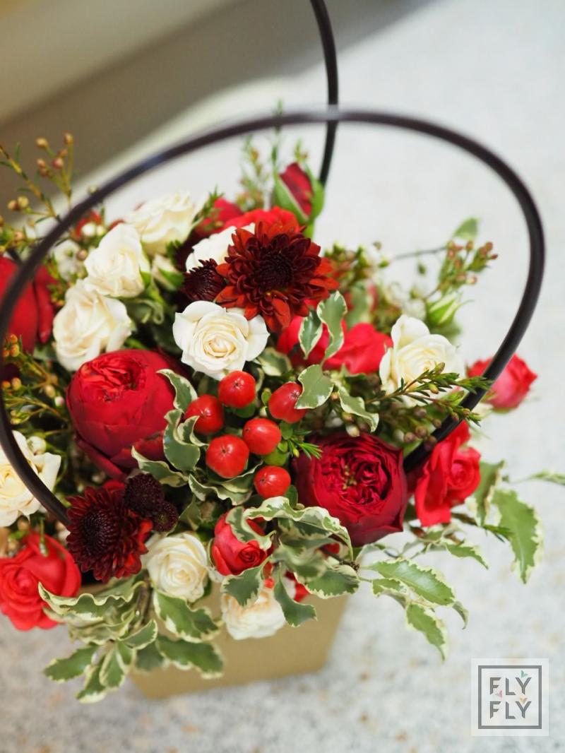 В составе: роза пионовидная сорта "Ред Пиано", роза кустовая, гиперикум, хамелациум, питоспорум, астра кустовая.