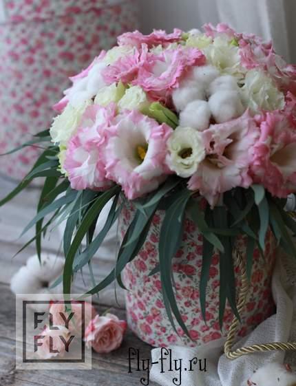 Удивительно воздушный и нежный букет в красивой шляпной коробке! Букет состоит из кружевного лизиантуса, очень красивого и стойкого цветка. Ощущение воздушности добавляет хлопок: словно маленькие облачки посреди рассветного розовеющего утра. Цветы находятся во флористической губке и будут радовать не меньше недели.