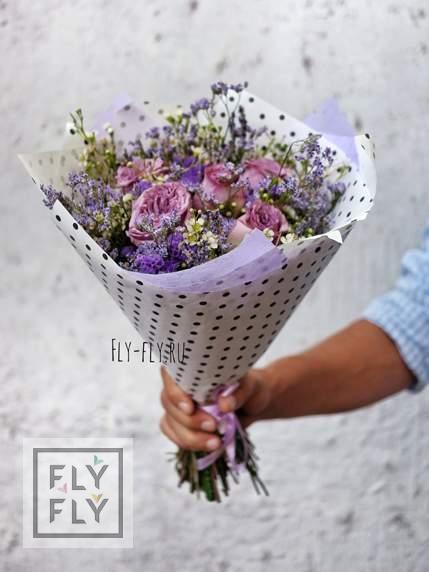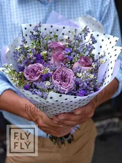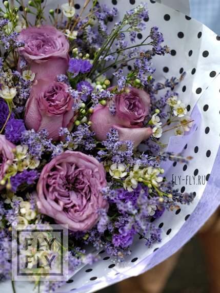 Этот букет с тонким ароматом лаванды так тонко передает настроение Прованса! Нежные лавандовые розы идеально дополняет лавандовый лимониум. И еще обязательно разотрите в руках листик шамелациума, растения с небольшими белыми цветами, и насладитесь его удивительным запахом.