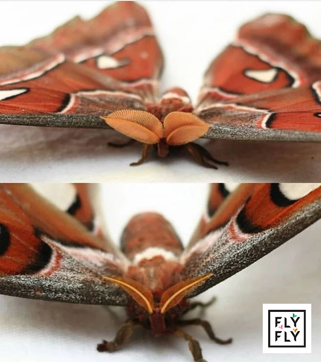 А вот понять какого пола мотылек у вас родился вы легко можете по их антеннам! У самки на фото антенны скромные и узкие, а у самца широкие и пышные. Для самца это несет стратегическое значение, ведь именно он отправляется на поиски дамы сердца и своими шикарными антеннами пользуется как мы носом. Он чует феромоны самки за 7 км против ветра! А самка тем временем сидит на месте и дожидается самого быстрого самца :)