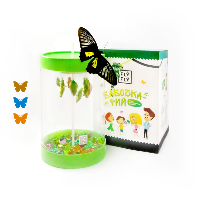 Важно: при покупке Бабочкария следите за наличием защитной голограммы Флай-Флай. С ней вы получите настоящую ферму бабочек, в которой создаются оптимальные условия для рождения бабочек.