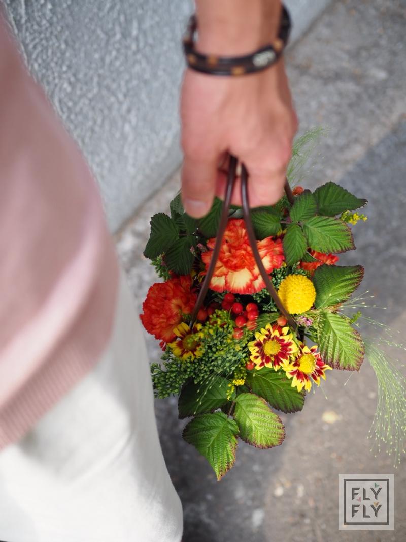 В составе: диантус, краспедия, калина, хризантема кустовая, седум, солидаго, паникум и малина.