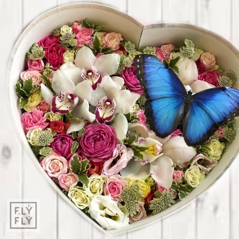 Только представьте, человек открывает подарочную коробку, а в ней невероятно стильный букет с цветами и живыми тропическими бабочки! Это будет самый небанальный подарок, который когда либо вы могли сделать!