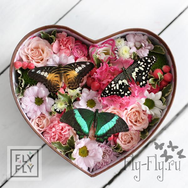 По-девичьи нежная композиция из воздушных цветов идеально подчеркнет красоту бабочек. Цветы находятся в флористической губке и будут радовать не меньше недели. Бабочки в стоимость не включены.